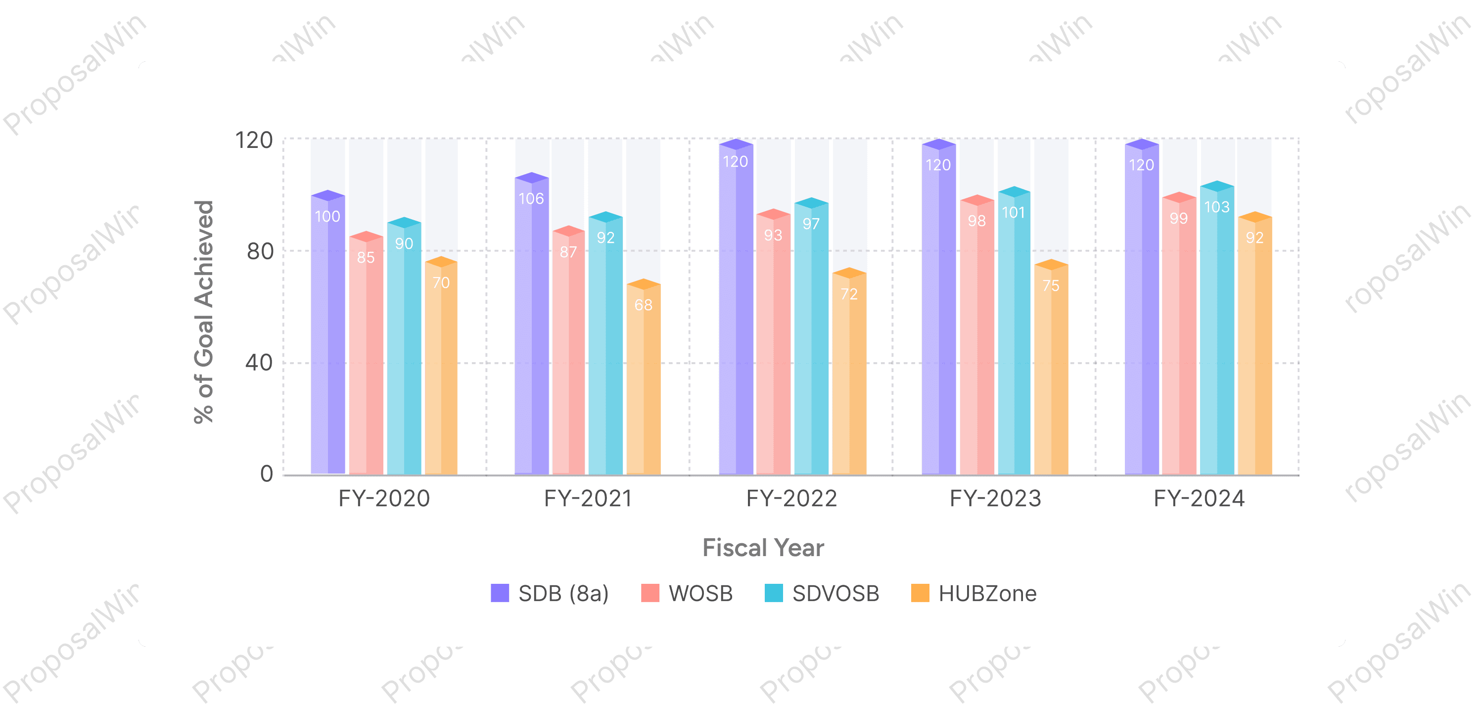 contracting goals between FY2020 and FY2024. Values exceeding 100% indicate categories that exceeded