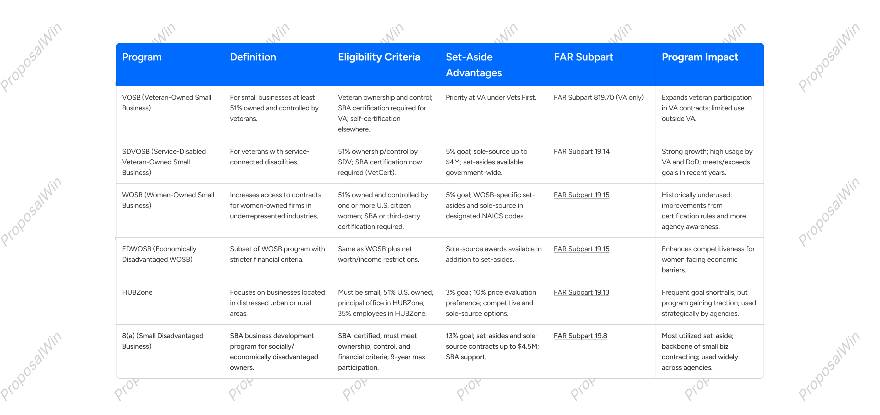 Not all small businesses are the same. The SBA recognizes several categories of small businesses for set-aside contracts, each with its own eligibility criteria and unique benefits. The main SBA socio-economic set-aside programs are: